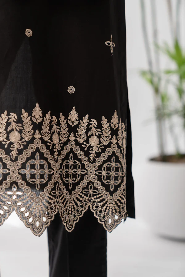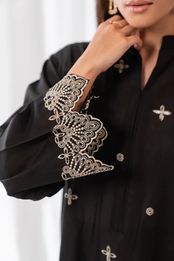 The pearly details on a black canvas wraps you in ethnic elegance.