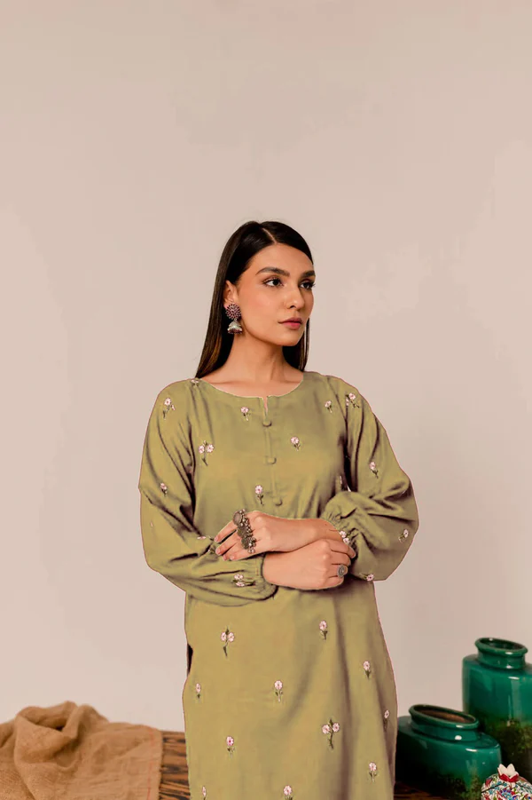 Step into winter with elegance in the Gold Rose 2-Piece Fully Embroidered Winter Dress. Crafted from premium viscose fabric, the shirt features intricate embroidery across the front, adding a touch of sophistication to its warm gold-pista hue.