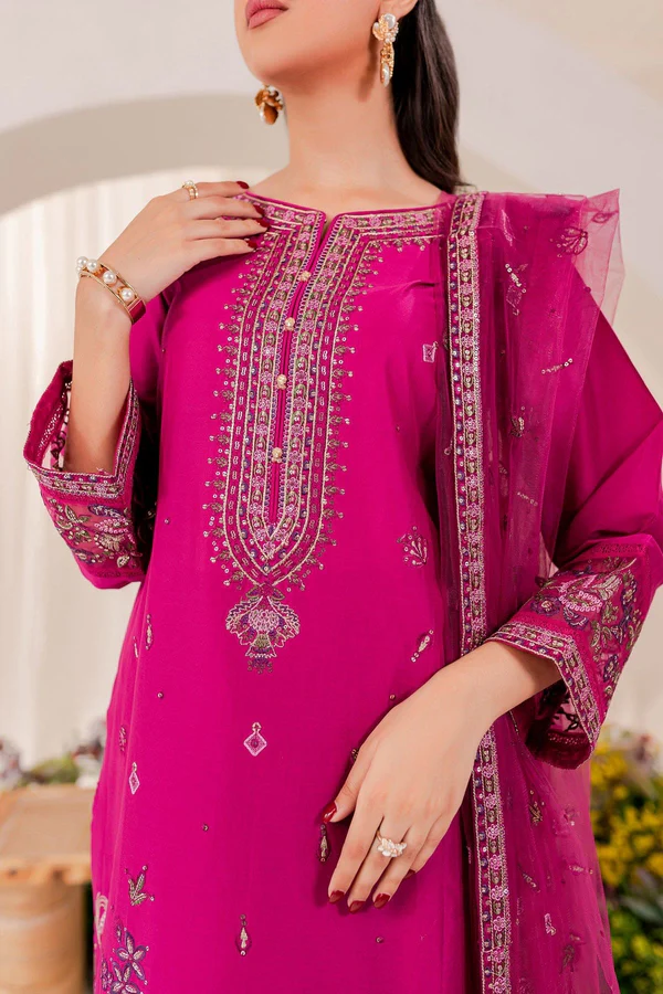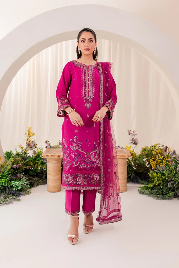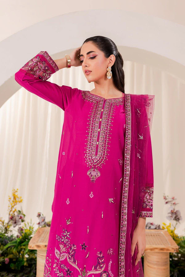 A pop of vibrant elegance to your wardrobe with the Pink Punch 3-Piece Embroidered Lawn Dress by Zilly Fashion. Featuring an ultra-pink embroidered shirt, delicately embellished net dupatta, and cambric trousers with embroidered hem, this set combines festive charm with everyday comfort.
