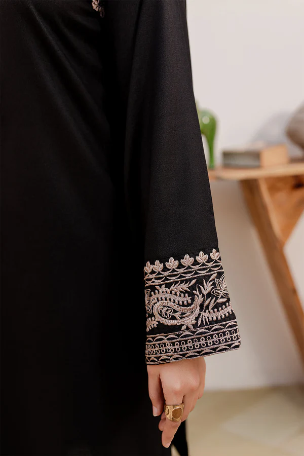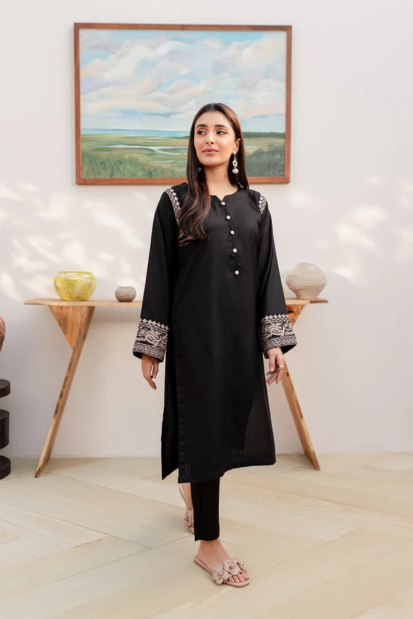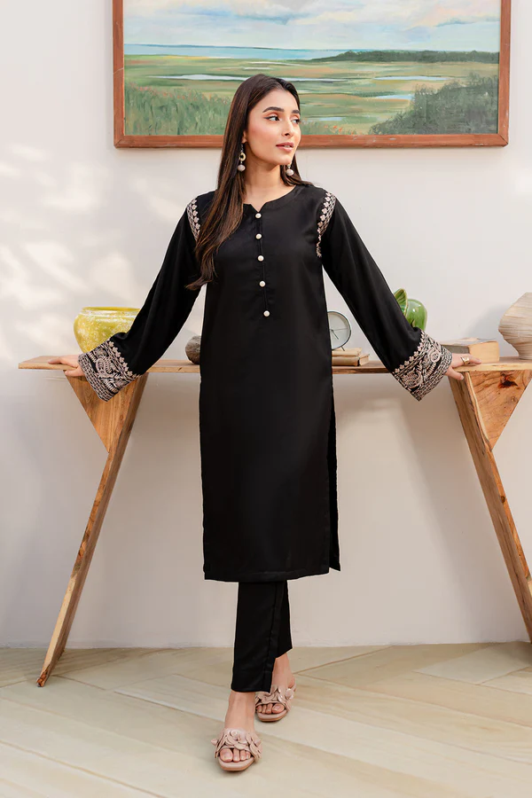Upgrade your ethnic wardrobe with the Rimsha 2-Piece Embroidered Stitched Dress by Zilly Fashion. Featuring a delicately embroidered black shirt paired with a plain trouser, this easy-fit ensemble combines elegance with everyday comfort.