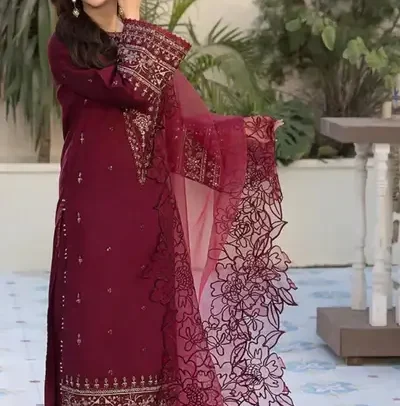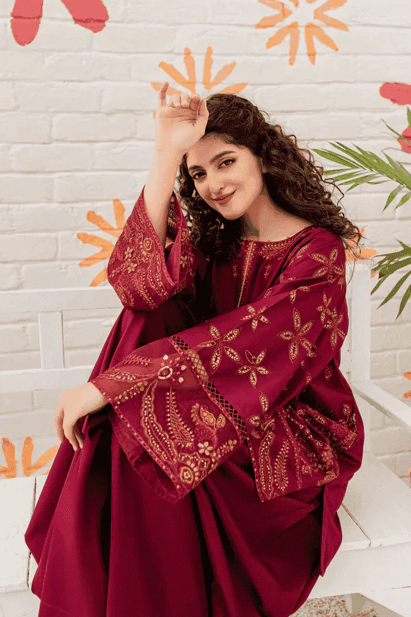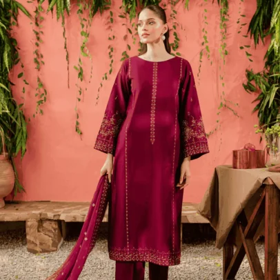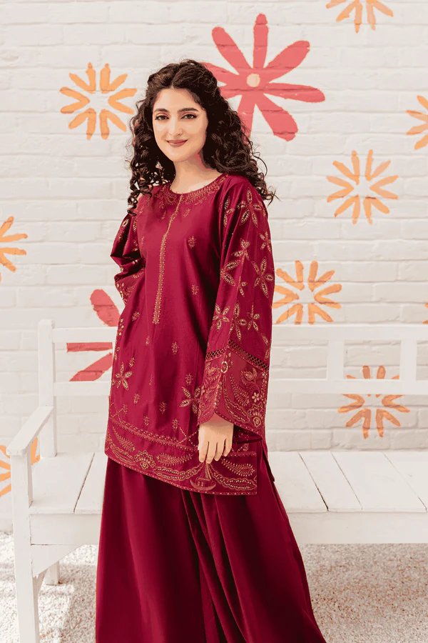Elevate your winter wardrobe with the Rosewood 2-Piece Embroidered Winter Dress. Crafted from premium Khaddar fabric, the maroon kurta is designed with a loose, comfortable cut and adorned with intricate sequin embroidery in contrasting hues for a touch of glamour.