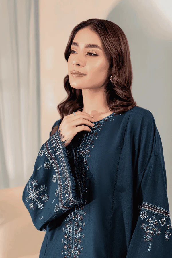 Elevate your winter wardrobe with the Sooya 2-Piece Embroidered Winter Dress. Crafted from premium Peach Dhanak in a rich blueberry blue shade, the paneled shirt showcases intricate embroidery on the front and delicate embellishments at the neckline. The drop-shoulder sleeves feature composed embroidery with fray finishing, adding a contemporary touch to this classic design.