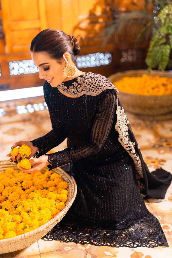 Make a statement with the Onyx Dove 3Pc Embroidered Chiffon Dress, a luxurious deep black ensemble featuring intricate sequins embroidery, delicate organza lace, and elegant raw silk bottoms. Perfect for weddings, festive occasions, or evening events, this outfit redefines sophistication and style.